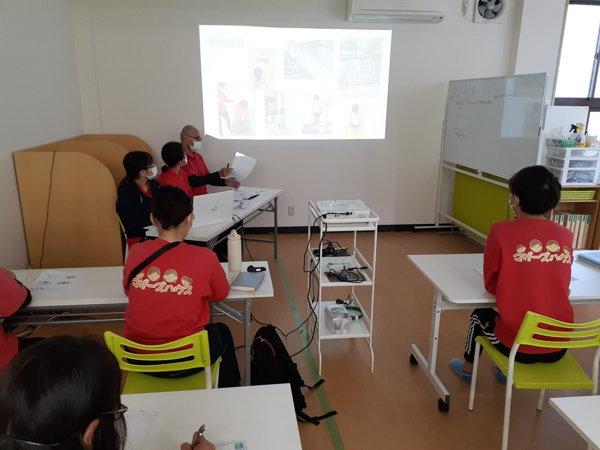 普段の支援の中で気になったことや発見など、日々情報交換を行い、アドバイスを受けながらスタッフ皆で療育に関わっています。また、定期的にセラピストやアドバイザーからスタッフへの勉強会を開催してもらい、専門的な知識を全スタッフで学び、支援へとつなげています。